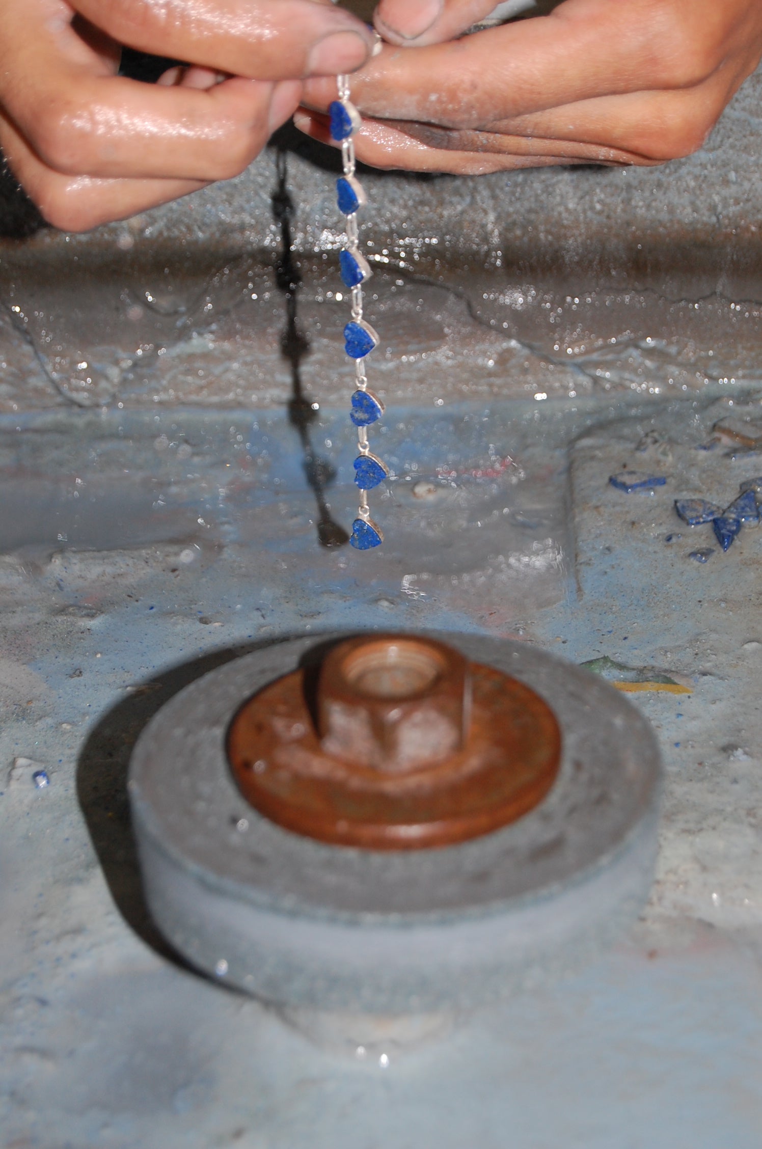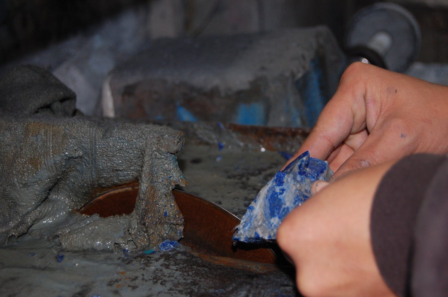 Lapis lazuli must be cut with precision, as the stone is both dense and unpredictable. Using diamond-edged circular blades, artisans carefully section each piece to preserve its natural structure and color. A single miscut can compromise the integrity of the stone, making this one of the most exacting stages of the process.