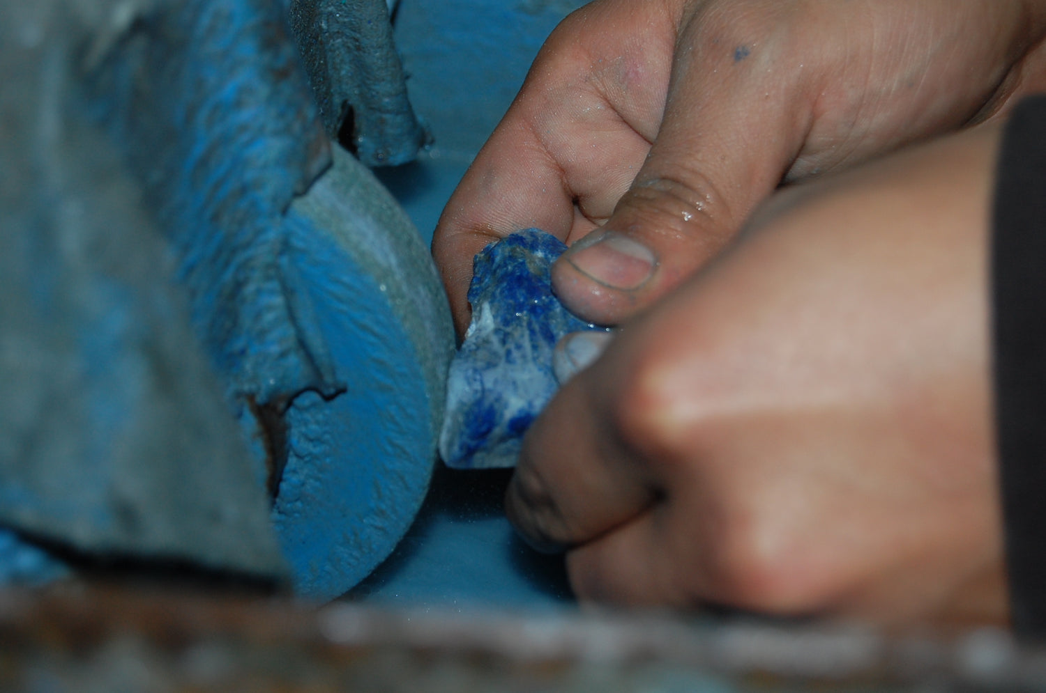 After cutting, the stone is gradually shaped using diamond-embedded grinding wheels. This stage establishes the form of each piece, allowing the artisan to work with the natural contours and variations within the lapis.